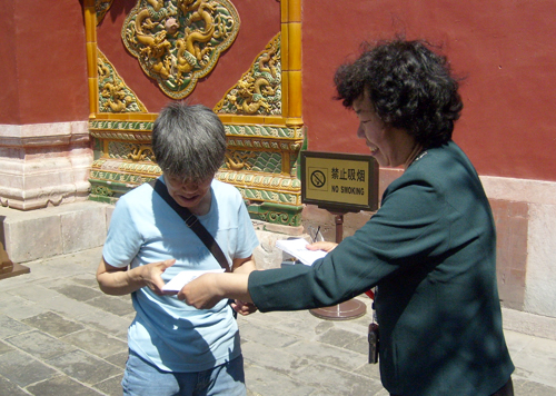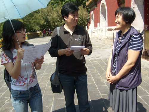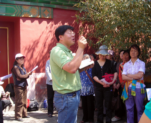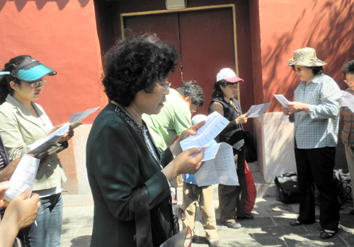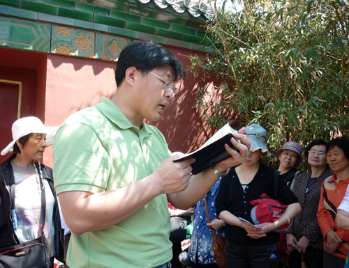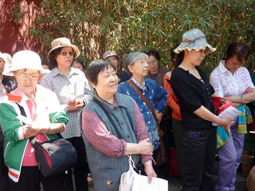 在一处红墙绿瓦的院子一角,我们开始了崇拜。赵馨芳姊妹带领大家唱了几首赞美诗歌,接下来是刘官长老讲道。他引用了提多书2章2、3两节经文,劝慰老年基督徒要节制、端庄自守,要有信心,举止要恭敬等等。这些经文是老年信徒的生活准则,要求我们自律,以身作则,为年轻信徒作榜样,并提醒我们今后在灵程的路上要谨记神的话,顺服在神的话语之下,作神喜悦和合用的器皿。在听道过程中,时不时有游人加入我们的听道。我们也散发了福音小册子,并邀请他们信主。