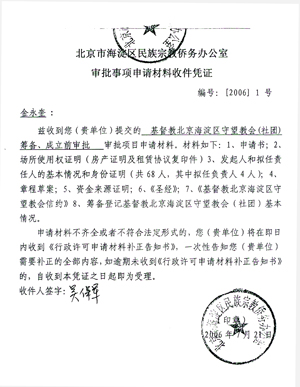 • 北京市海淀区民族宗教侨务办室行政审批事项受理通知书